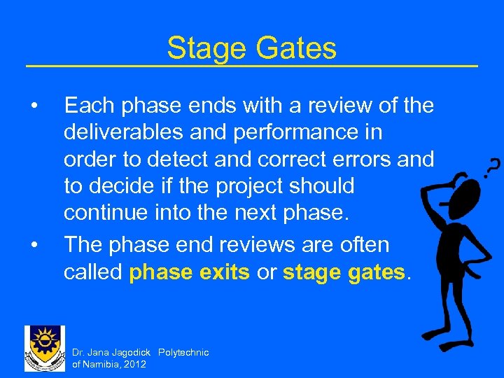 Stage Gates • • Each phase ends with a review of the deliverables and performance in order to detect and correct errors and to decide if the project should continue into the next phase. The phase end reviews are often called phase exits or stage gates. Dr. Jana Jagodick Polytechnic of Namibia, 2012