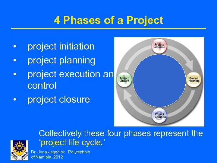 4 Phases of a Project • • project initiation project planning project execution and control project closure Collectively these four phases represent the ‘project life cycle. ’ Dr. Jana Jagodick Polytechnic of Namibia, 2012