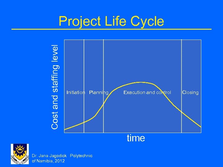 Cost and staffing level Project Life Cycle Initiation Planning Execution and control time Dr. Jana Jagodick Polytechnic of Namibia, 2012 Closing