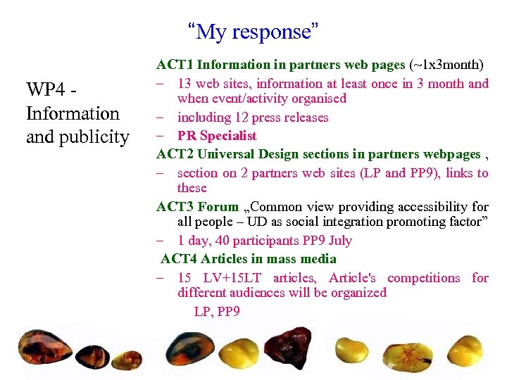 “My response” WP 4 Information and publicity ACT 1 Information in partners web pages (~1 x 3 month) – 13 web sites, information at least once in 3 month and when event/activity organised – including 12 press releases – PR Specialist ACT 2 Universal Design sections in partners webpages , – section on 2 partners web sites (LP and PP 9), links to these ACT 3 Forum „Common view providing accessibility for all people – UD as social integration promoting factor” – 1 day, 40 participants PP 9 July ACT 4 Articles in mass media – 15 LV+15 LT articles, Article's competitions for different audiences will be organized LP, PP 9