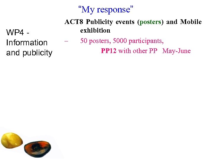 “My response” WP 4 Information and publicity ACT 8 Publicity events (posters) and Mobile exhibition – 50 posters, 5000 participants, PP 12 with other PP May-June