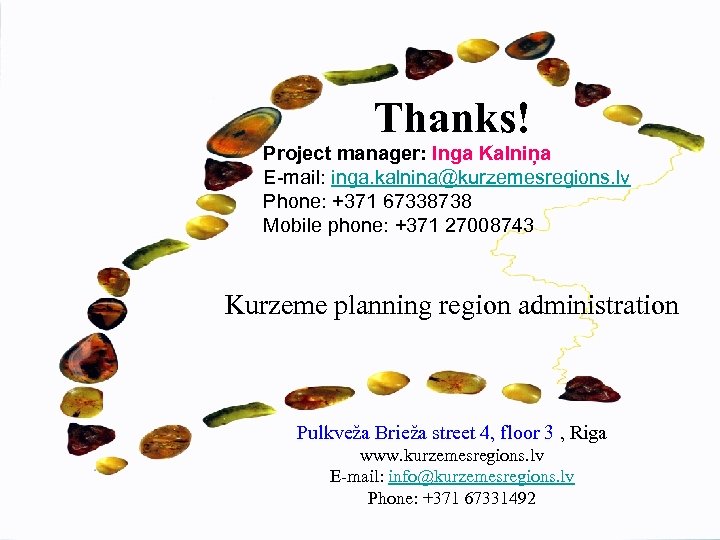 Thanks! Project manager: Inga Kalniņa E-mail: inga. kalnina@kurzemesregions. lv Phone: +371 67338738 Mobile phone: +371 27008743 Kurzeme planning region administration Pulkveža Brieža street 4, floor 3 , Riga www. kurzemesregions. lv E-mail: info@kurzemesregions. lv Phone: +371 67331492