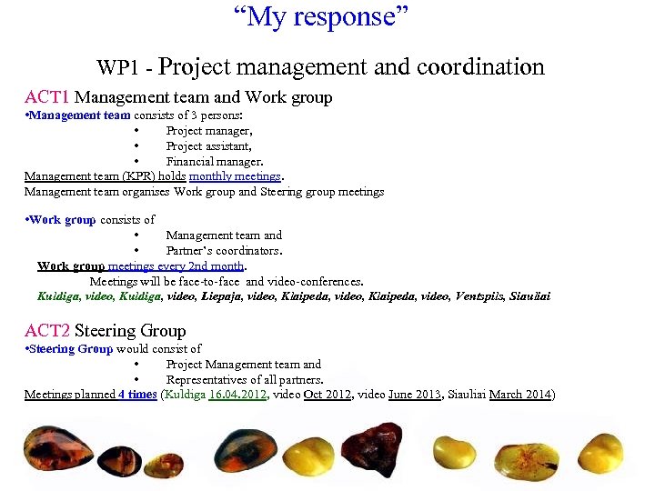“My response” WP 1 - Project management and coordination ACT 1 Management team and Work group • Management team consists of 3 persons: • Project manager, • Project assistant, • Financial manager. Management team (KPR) holds monthly meetings. Management team organises Work group and Steering group meetings • Work group consists of • Management team and • Partner’s coordinators. Work group meetings every 2 nd month. Meetings will be face-to-face and video-conferences. Kuldiga, video, Liepaja, video, Klaipeda, video, Ventspils, Siauliai ACT 2 Steering Group • Steering Group would consist of • Project Management team and • Representatives of all partners. Meetings planned 4 times (Kuldiga 16. 04. 2012, video Oct 2012, video June 2013, Siauliai March 2014)