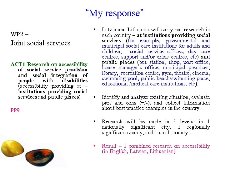 “My response” WP 2 – • Latvia and Lithuania will carry-out research in each country – at institutions providing social services (for example, governmental and municipal social care institutions for adults and children, social service offices, day care centres, support and/or crisis centres, etc) and public places (bus station, shop, post office, house manager’s office, municipal premises, library, recreation centre, gym, theatre, cinema, swimming pool, public beach/swimming place, educational /medical care institutions, etc). • Identify and analyze existing situation, evaluate pros and cons (+/-), and collect information about best practice examples in the country. • Research will be made in 3 levels: in 1 nationally significant city, 1 regionally significant county, and 1 small county. • Result – 1 combined research on accessibility (in English, Latvian, Lithuanian) Joint social services ACT 1 Research on accessibility of social service provision and social integration of people with disabilities (accessibility providing at – institutions providing social services and public places) PP 9