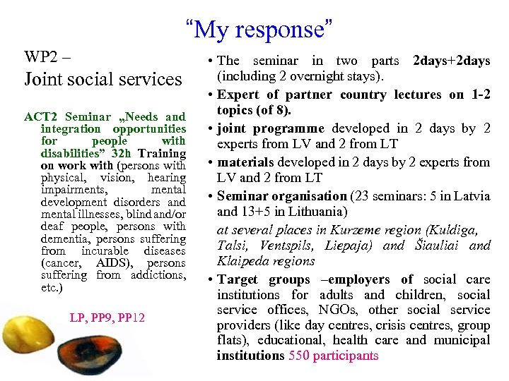 “My response” WP 2 – Joint social services ACT 2 Seminar „Needs and integration opportunities for people with disabilities” 32 h Training on work with (persons with physical, vision, hearing impairments, mental development disorders and mental illnesses, blind and/or deaf people, persons with dementia, persons suffering from incurable diseases (cancer, AIDS), persons suffering from addictions, etc. ) LP, PP 9, PP 12 • The seminar in two parts 2 days+2 days (including 2 overnight stays). • Expert of partner country lectures on 1 -2 topics (of 8). • joint programme developed in 2 days by 2 experts from LV and 2 from LT • materials developed in 2 days by 2 experts from LV and 2 from LT • Seminar organisation (23 seminars: 5 in Latvia and 13+5 in Lithuania) at several places in Kurzeme region (Kuldiga, Talsi, Ventspils, Liepaja) and Šiauliai and Klaipeda regions • Target groups –employers of social care institutions for adults and children, social service offices, NGOs, other social service providers (like day centres, crisis centres, group flats), educational, health care and municipal institutions 550 participants
