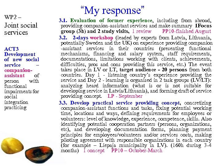WP 2 – Joint social services ACT 3 Development of new social service – companionassistant of person with functional impairments for social integration practicing “My response” 3. 1. Evaluation of former experience, including from abroad, providing companion-assistant services and make summary 1 Focus group (3 h) and 2 study visits, 1 review PP 10 -finished August 3. 2. 2 -days workshop (leaded by experts from Latvia, Lithuania, potentially Sweden and the UK) on experience providing companion -assistant services in their countries (presenting functional mechanisms, financing and salary system, staff requirements, documentations, limitations working with clients, achievements, difficulties, pros and cons providing this service, etc. ) The event takes place in LV or LT, target audience - 20 persons from both countries. Day 1 - listening country’s experience providing the service and Day 2 - learning is organised in 2 task groups (LV/LT): analyzing heard information (what is or is not suitable for developing service in Latvia/Lithuania), and forming draft of service providing concept. LP - September 3. 3. Develop practical service providing concept, concretizing companion-assistant functions and tasks, fixing potential working time, locations and ways, defining requirements for employees or volunteers: level of knowledge, experience, competence, skills. Also identifying potential cooperation partners (persons, organizations, etc), and developing documentation forms, planning payment principles for employees/volunteers and/or services costs, making piloting agreement with responsible organizations in each country (for example – Liepaja municipality in LV). (160 h during 3 -4 months) 1 concept PP 10 – October-March