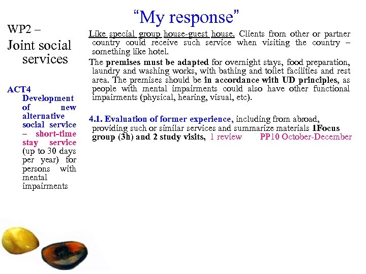 WP 2 – Joint social services ACT 4 Development of new alternative social service – short-time stay service (up to 30 days per year) for persons with mental impairments “My response” Like special group house-guest house. Clients from other or partner country could receive such service when visiting the country – something like hotel. The premises must be adapted for overnight stays, food preparation, laundry and washing works, with bathing and toilet facilities and rest area. The premises should be in accordance with UD principles, as people with mental impairments could also have other functional impairments (physical, hearing, visual, etc). 4. 1. Evaluation of former experience, including from abroad, providing such or similar services and summarize materials 1 Focus group (3 h) and 2 study visits, 1 review PP 10 October-December