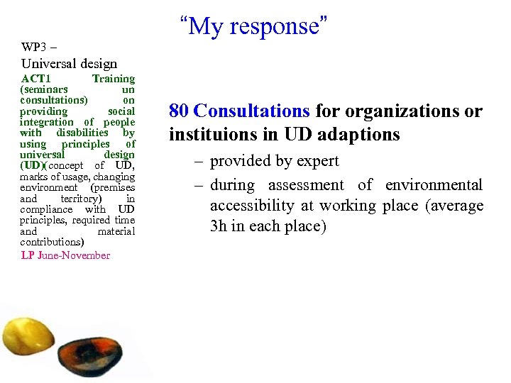 “My response” WP 3 – Universal design ACT 1 Training (seminars un consultations) on providing social integration of people with disabilities by using principles of universal design (UD)(concept of UD, marks of usage, changing environment (premises and territory) in compliance with UD principles, required time and material contributions) LP June-November 80 Consultations for organizations or instituions in UD adaptions – provided by expert – during assessment of environmental accessibility at working place (average 3 h in each place)