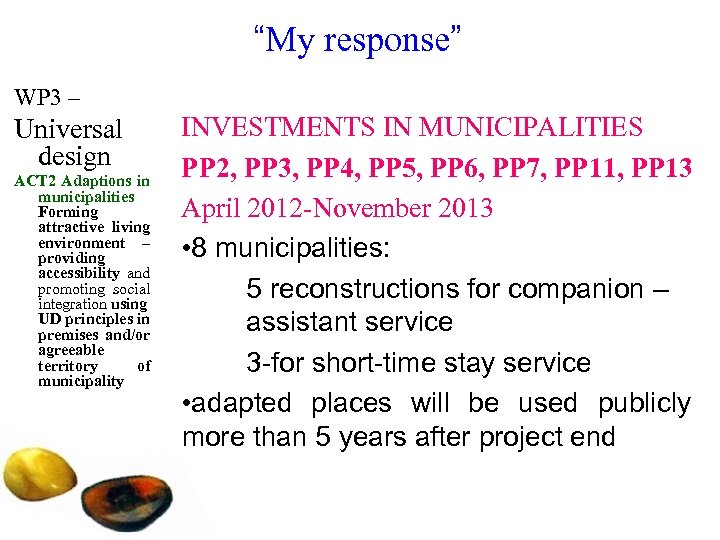“My response” WP 3 – Universal design ACT 2 Adaptions in municipalities Forming attractive living environment – providing accessibility and promoting social integration using UD principles in premises and/or agreeable territory of municipality INVESTMENTS IN MUNICIPALITIES PP 2, PP 3, PP 4, PP 5, PP 6, PP 7, PP 11, PP 13 April 2012 -November 2013 • 8 municipalities: 5 reconstructions for companion – assistant service 3 -for short-time stay service • adapted places will be used publicly more than 5 years after project end