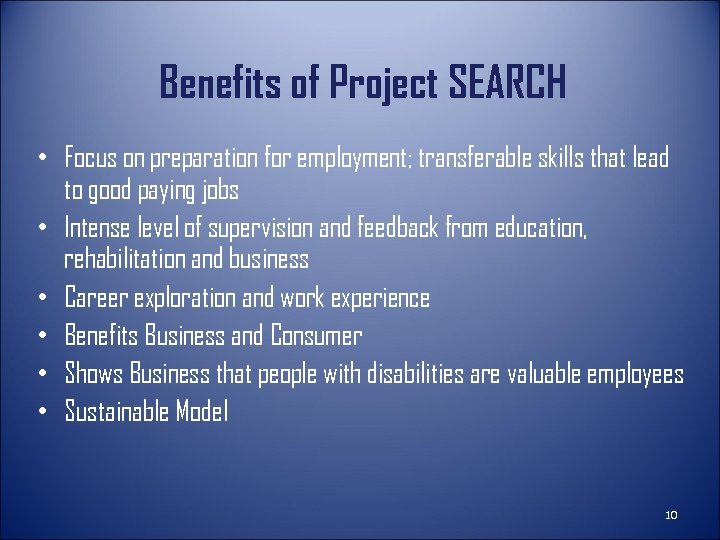 Project SEARCH Indiana Roll-out √ √ √ • • • Feb 2008: Pilot Site with 5 students operated under VR grant Fall 08: 3 Sites Operating with 8 -12 students each Spring 09: 2 hires at Intern sites Fall 09: 6 -8 Sites Operating (1 -2 Adult model) Fall 10: 10 Sites Operating Long-term goals: viable Project SEARCH sites throughout the state; exploration of an adult model; examination of its adaptability other business settings and to rural settings 9