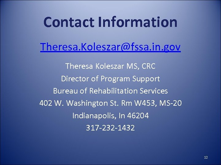 Contact Information Theresa. Koleszar@fssa. in. gov Theresa Koleszar MS, CRC Director of Program Support Bureau of Rehabilitation Services 402 W. Washington St. Rm W 453, MS-20 Indianapolis, In 46204 317 -232 -1432 12