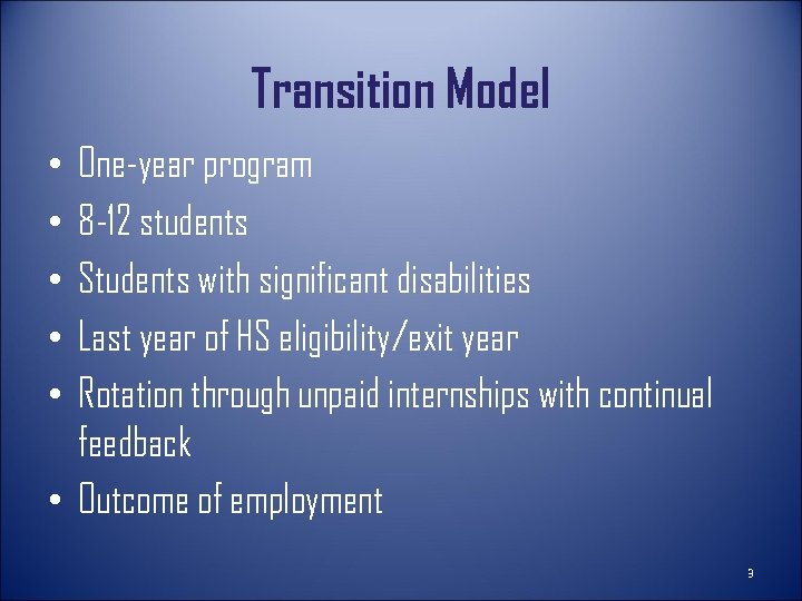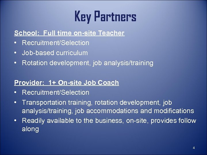 Transition Model One-year program 8 -12 students Students with significant disabilities Last year of HS eligibility/exit year Rotation through unpaid internships with continual feedback • Outcome of employment • • • 3