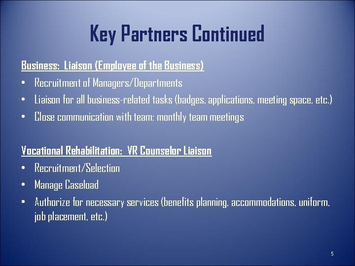 Key Partners School: Full time on-site Teacher • Recruitment/Selection • Job-based curriculum • Rotation development, job analysis/training Provider: 1+ On-site Job Coach • Recruitment/Selection • Transportation training, rotation development, job analysis/training, job accommodations and modifications • Readily available to the business, on-site, provides follow along 4