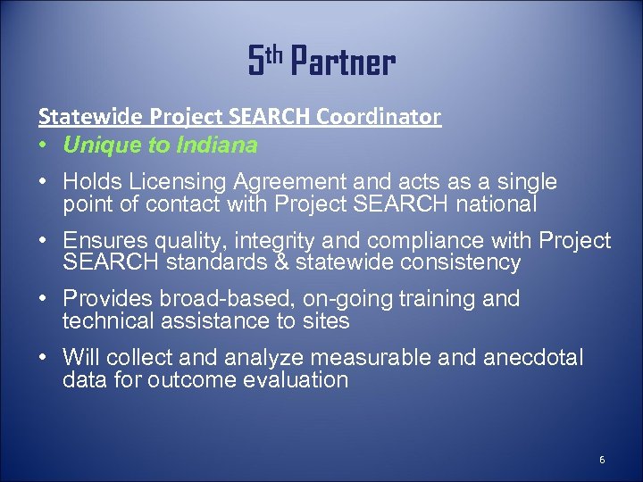 5 th Partner Statewide Project SEARCH Coordinator • Unique to Indiana • Holds Licensing Agreement and acts as a single point of contact with Project SEARCH national • Ensures quality, integrity and compliance with Project SEARCH standards & statewide consistency • Provides broad-based, on-going training and technical assistance to sites • Will collect and analyze measurable and anecdotal data for outcome evaluation 6