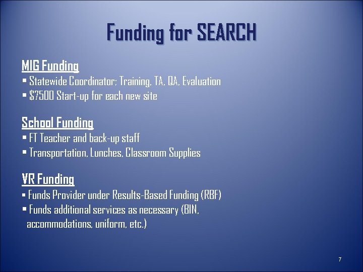 Funding for SEARCH MIG Funding • Statewide Coordinator; Training, TA, QA, Evaluation • $7500 Start-up for each new site School Funding • FT Teacher and back-up staff • Transportation, Lunches, Classroom Supplies VR Funding • Funds Provider under Results-Based Funding (RBF) • Funds additional services as necessary (BIN, accommodations, uniform, etc. ) 7