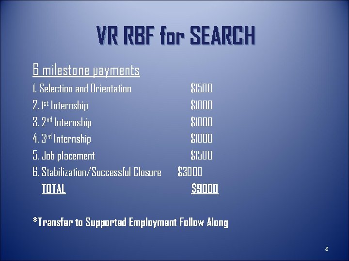 VR RBF for SEARCH 6 milestone payments 1. Selection and Orientation 2. 1 st Internship 3. 2 nd Internship 4. 3 rd Internship 5. Job placement 6. Stabilization/Successful Closure TOTAL $1500 $1000 $1500 $3000 $9000 *Transfer to Supported Employment Follow Along 8