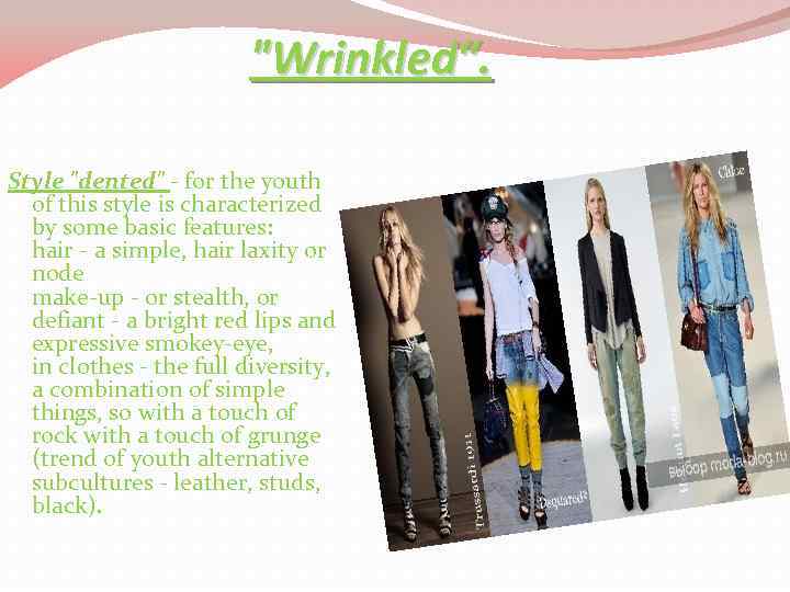 "Wrinkled“. Style "dented" - for the youth of this style is characterized by some basic features: hair - a simple, hair laxity or node make-up - or stealth, or defiant - a bright red lips and expressive smokey-eye, in clothes - the full diversity, a combination of simple things, so with a touch of rock with a touch of grunge (trend of youth alternative subcultures - leather, studs, black).