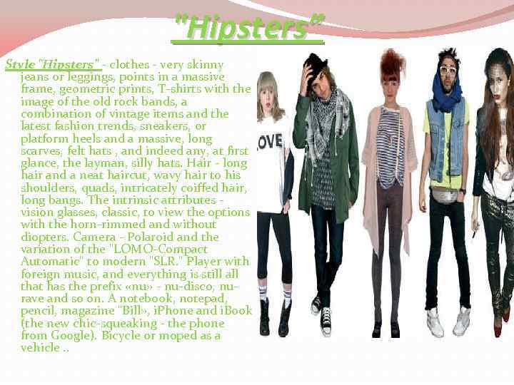 "Hipsters” Style "Hipsters" - clothes - very skinny jeans or leggings, points in a massive frame, geometric prints, T-shirts with the image of the old rock bands, a combination of vintage items and the latest fashion trends, sneakers, or platform heels and a massive, long scarves, felt hats , and indeed any, at first glance, the layman, silly hats. Hair - long hair and a neat haircut, wavy hair to his shoulders, quads, intricately coiffed hair, long bangs. The intrinsic attributes vision glasses, classic, to view the options with the horn-rimmed and without diopters. Camera - Polaroid and the variation of the "LOMO-Compact Automatic" to modern "SLR. " Player with foreign music, and everything is still all that has the prefix «nu» - nu-disco, nurave and so on. A notebook, notepad, pencil, magazine "Bill» , i. Phone and i. Book (the new chic-squeaking - the phone from Google). Bicycle or moped as a vehicle. .