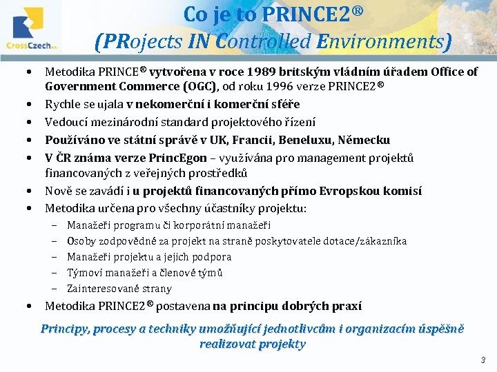 Management kvality v Cross Czech a. s. Ø ČSN EN ISO 9001: 2009 § Projektové poradenství § Projektový management § Evaluace a monitoring Ø PRINCE 2®: Pracovníci Cross Czech a. s. jsou držiteli certifikátu PRINCE 2® Practitioner Ø ISO 10006: 2003 § ISO/IEC Guide 73: 2002 - Risk Management § ISC 62/198: 2001 - Project Risk Management § EN ISO 10007: 03 - Configuration Management Certifikát byl vystaven pro: § "assesment audity" dle projektového řízení metodiky PRINCE 2® § implementace standardů projektového řízení § řízení projektových rizik 2