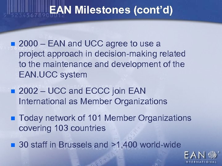 EAN Milestones (cont’d) n 2000 – EAN and UCC agree to use a project approach in decision-making related to the maintenance and development of the EAN. UCC system n 2002 – UCC and ECCC join EAN International as Member Organizations n Today network of 101 Member Organizations covering 103 countries n 30 staff in Brussels and >1, 400 world-wide