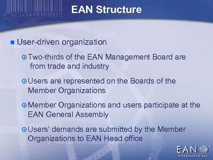 EAN Structure n User-driven organization ¤ Two-thirds of the EAN Management Board are from trade and industry ¤ Users are represented on the Boards of the Member Organizations ¤ Member Organizations and users participate at the EAN General Assembly ¤ Users’ demands are submitted by the Member Organizations to EAN Head office