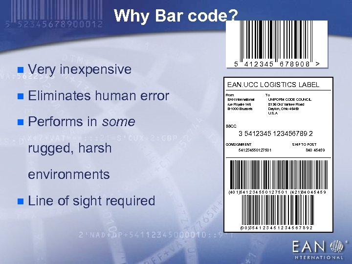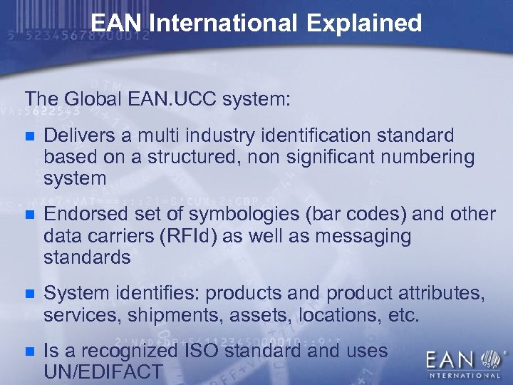 EAN International Explained The Global EAN. UCC system: n Delivers a multi industry identification standard based on a structured, non significant numbering system n Endorsed set of symbologies (bar codes) and other data carriers (RFId) as well as messaging standards n System identifies: products and product attributes, services, shipments, assets, locations, etc. n Is a recognized ISO standard and uses UN/EDIFACT