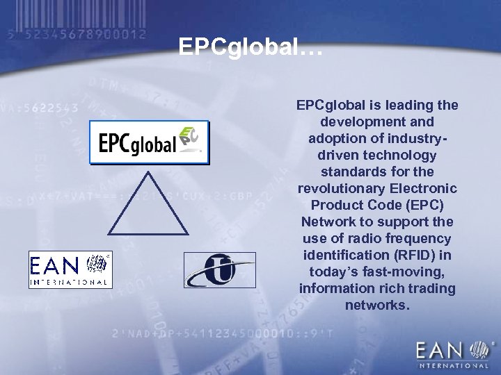 EPCglobal… EPCglobal is leading the development and adoption of industrydriven technology standards for the revolutionary Electronic Product Code (EPC) Network to support the use of radio frequency identification (RFID) in today’s fast-moving, information rich trading networks.