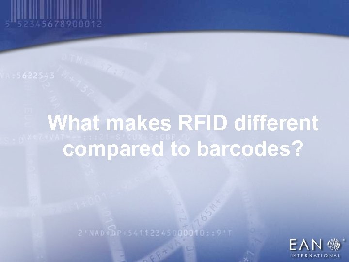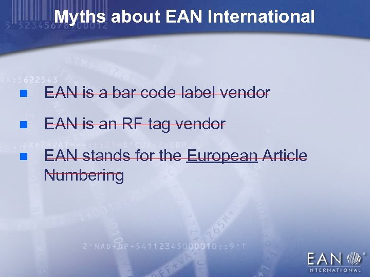 Myths about EAN International n –––––––––––––––––– EAN is a bar code label vendor n ––––––––––––––– EAN is an RF tag vendor n EAN stands for the European Article ––––––––––––––––––––– Numbering