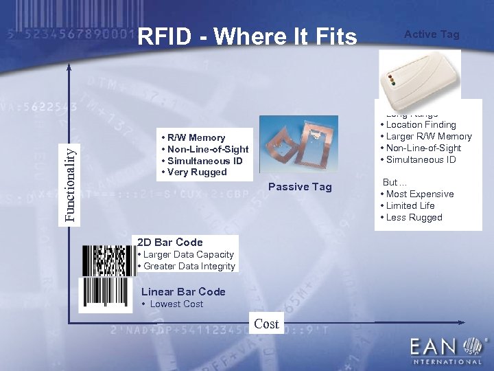 Functionality RFID - Where It Fits Active Tag • Long Range • Location Finding • Larger R/W Memory • Non-Line-of-Sight • Simultaneous ID • R/W Memory • Non-Line-of-Sight • Simultaneous ID • Very Rugged Passive Tag 2 D Bar Code • Larger Data Capacity • Greater Data Integrity Linear Bar Code • Lowest Cost But. . . • Most Expensive • Limited Life • Less Rugged