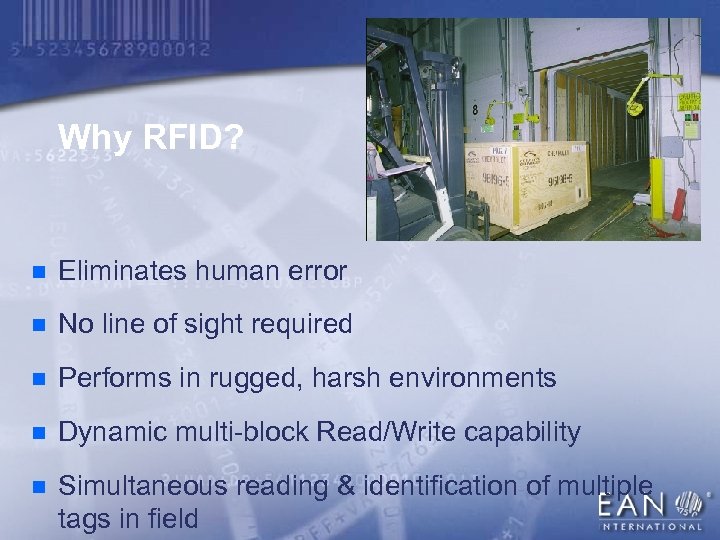 Why RFID? n Eliminates human error n No line of sight required n Performs in rugged, harsh environments n Dynamic multi-block Read/Write capability n Simultaneous reading & identification of multiple tags in field