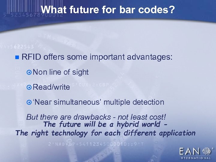 What future for bar codes? n RFID offers some important advantages: ¤ Non line of sight ¤ Read/write ¤ ‘Near simultaneous’ multiple detection But there are drawbacks - not least cost! The future will be a hybrid world The right technology for each different application