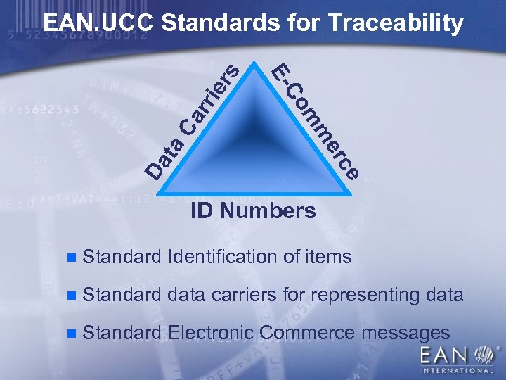 er ta Ca rri ce Da er m m Co E- s EAN. UCC Standards for Traceability ID Numbers n Standard Identification of items n Standard data carriers for representing data n Standard Electronic Commerce messages