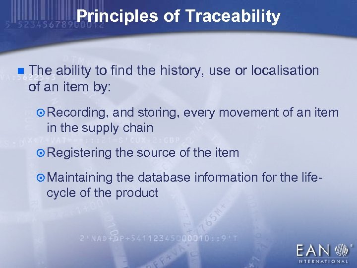 Principles of Traceability n The ability to find the history, use or localisation of an item by: ¤ Recording, and storing, every movement of an item in the supply chain ¤ Registering the source of the item ¤ Maintaining the database information for the life- cycle of the product