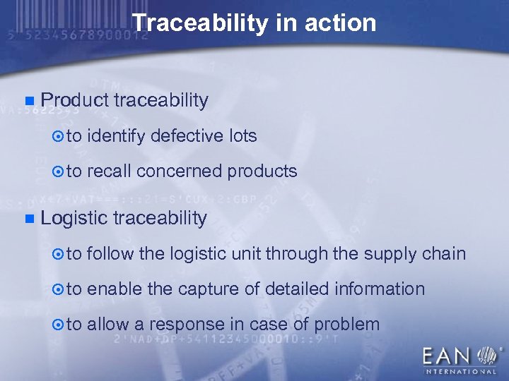 Traceability in action n Product traceability ¤ to identify defective lots ¤ to recall concerned products n Logistic traceability ¤ to follow the logistic unit through the supply chain ¤ to enable the capture of detailed information ¤ to allow a response in case of problem