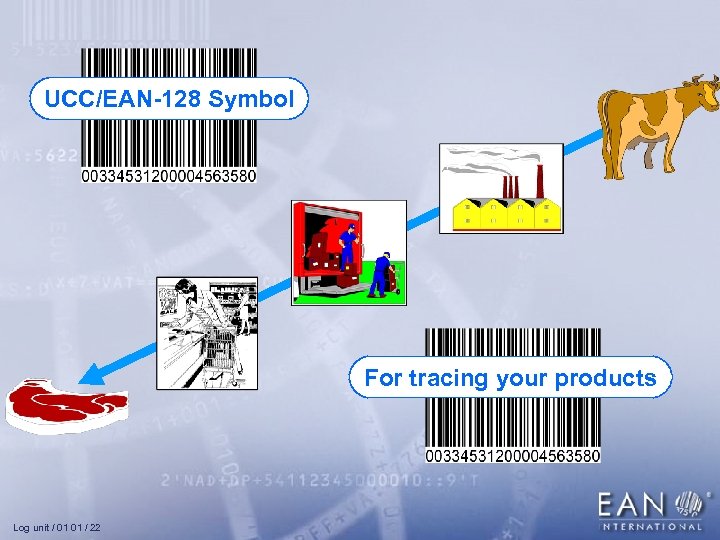 UCC/EAN-128 Symbol For tracing your products Log unit / 01 01 / 22