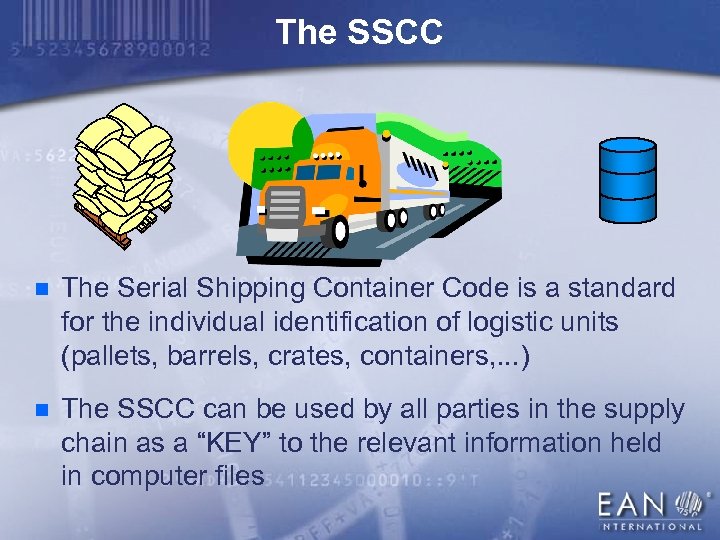 The SSCC n The Serial Shipping Container Code is a standard for the individual identification of logistic units (pallets, barrels, crates, containers, . . . ) n The SSCC can be used by all parties in the supply chain as a “KEY” to the relevant information held in computer files