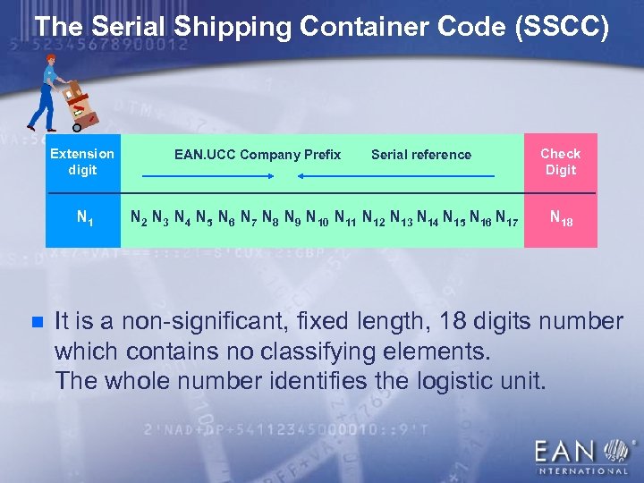 The Serial Shipping Container Code (SSCC) Extension digit N 1 n EAN. UCC Company Prefix Serial reference N 2 N 3 N 4 N 5 N 6 N 7 N 8 N 9 N 10 N 11 N 12 N 13 N 14 N 15 N 16 N 17 Check Digit N 18 It is a non-significant, fixed length, 18 digits number which contains no classifying elements. The whole number identifies the logistic unit.