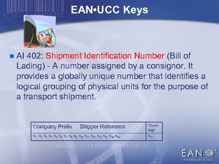 EAN • UCC Keys n AI 401: Consignment Number - Identifies a logical grouping of goods (one or more physical entities) that has been consigned to a freight forwarder and is intended to be transported as a whole. Company Prefix N 1. . . Consignment information Ni Xi+1. . . variable length Xj (j<=30)