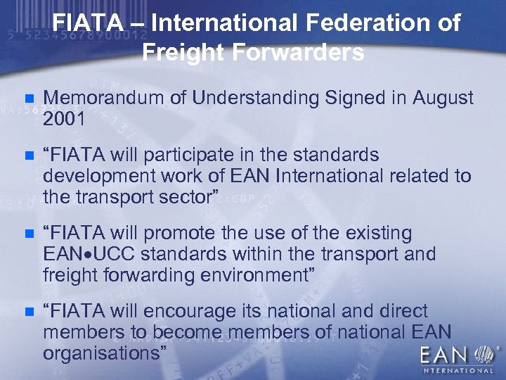 FIATA – International Federation of Freight Forwarders n Memorandum of Understanding Signed in August 2001 n “FIATA will participate in the standards development work of EAN International related to the transport sector” n “FIATA will promote the use of the existing EAN UCC standards within the transport and freight forwarding environment” n “FIATA will encourage its national and direct members to become members of national EAN organisations”