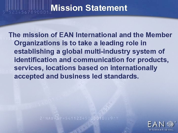 Mission Statement The mission of EAN International and the Member Organizations is to take a leading role in establishing a global multi-industry system of identification and communication for products, services, locations based on internationally accepted and business led standards.