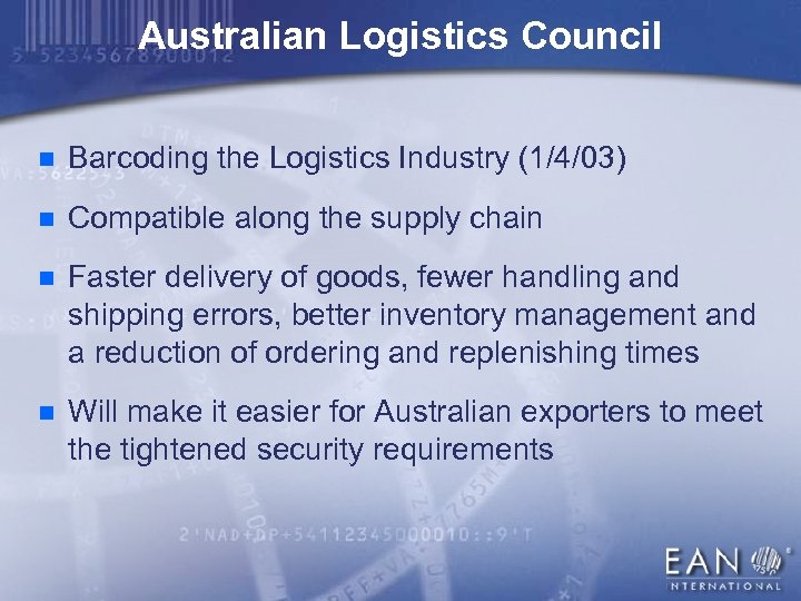 Australian Logistics Council n Barcoding the Logistics Industry (1/4/03) n Compatible along the supply chain n Faster delivery of goods, fewer handling and shipping errors, better inventory management and a reduction of ordering and replenishing times n Will make it easier for Australian exporters to meet the tightened security requirements