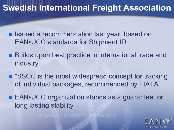 Swedish International Freight Association n Issued a recommendation last year, based on EAN • UCC standards for Shipment ID n Builds upon best practice in international trade and industry n “SSCC is the most widespread concept for tracking of individual packages, recommended by FIATA” n EAN • UCC organization stands as a guarantee for long lasting stability