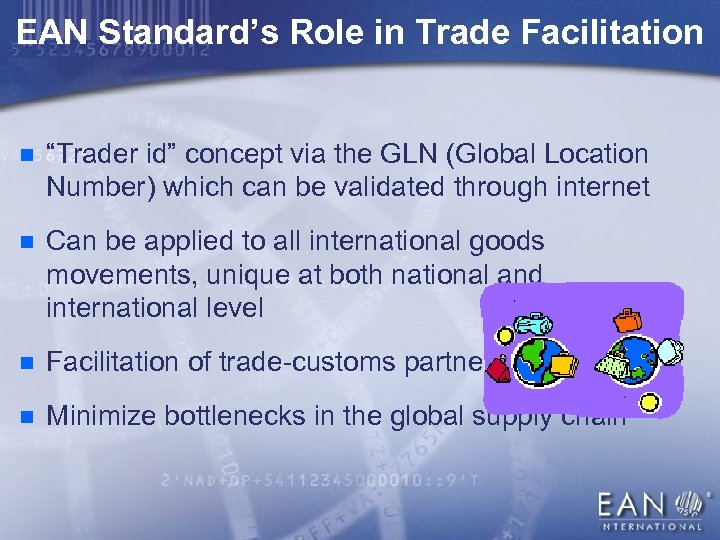 EAN Standard’s Role in Trade Facilitation n “Trader id” concept via the GLN (Global Location Number) which can be validated through internet n Can be applied to all international goods movements, unique at both national and international level n Facilitation of trade-customs partnership n Minimize bottlenecks in the global supply chain