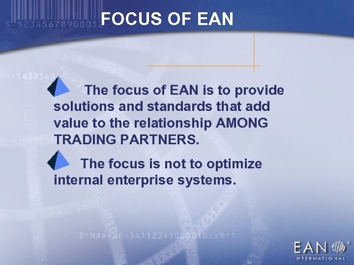 FOCUS OF EAN The focus of EAN is to provide solutions and standards that add value to the relationship AMONG TRADING PARTNERS. The focus is not to optimize internal enterprise systems.