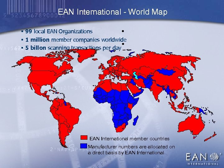 EAN International - World Map § 99 local EAN Organizations § 1 million member companies worldwide § 5 billon scanning transactions per day EAN International member countries Manufacturer numbers are allocated on a direct basis by EAN International