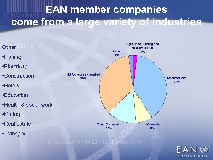 EAN member companies come from a large variety of industries Other: • Fishing • Electricity • Construction • Hotels • Education • Health & social work • Mining • Real estate • Transport