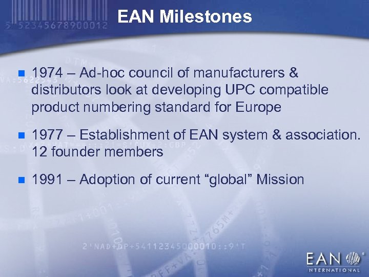 EAN Milestones n 1974 – Ad-hoc council of manufacturers & distributors look at developing UPC compatible product numbering standard for Europe n 1977 – Establishment of EAN system & association. 12 founder members n 1991 – Adoption of current “global” Mission