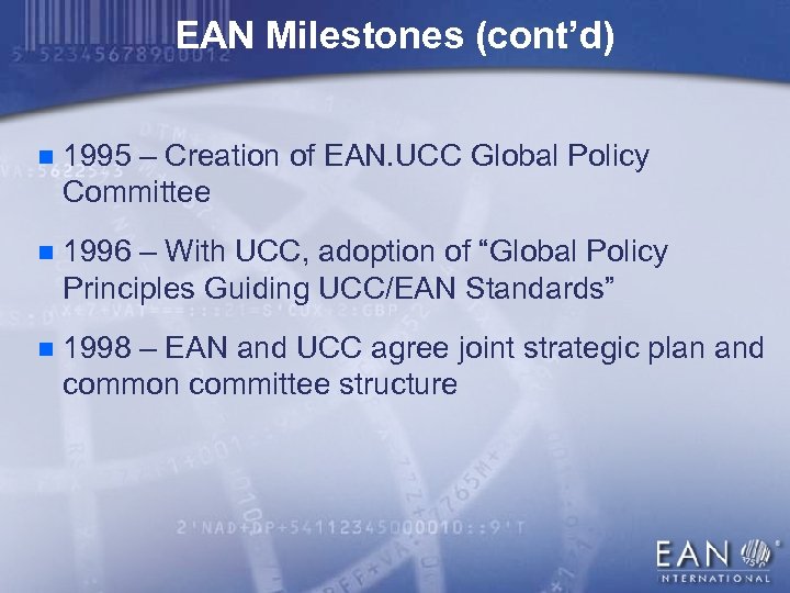 EAN Milestones (cont’d) n 1995 – Creation of EAN. UCC Global Policy Committee n 1996 – With UCC, adoption of “Global Policy Principles Guiding UCC/EAN Standards” n 1998 – EAN and UCC agree joint strategic plan and common committee structure