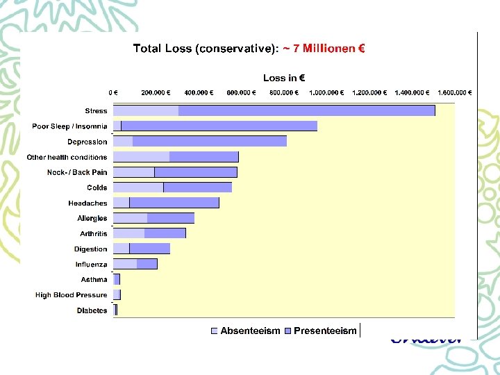 Management Summary – First results 1. High participation rate (>50%) Issue is important, there is interest and emotional pressure. 2. Vitality Index of our people is below average 3. Business case: Productivity loss of 21 days/employee/year - ca. 7 Mio Euro - ratio absenteeism / presenteeism: 4. (after corrections) 1: 3 Main issues: - stress, sleeping disorders, depression (50% of total loss!) - musculoskeletal-system 5. Target groups met! - 1, 400 downloads of specific info material - EAP – more consultations reported - problem solving takes place. 6. We know now, which problems our people have and what they wish, which help and way of helping they would like