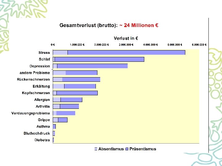 Absenteeism / Presenteeism Solutions Problems • Headache • Allergy Business case Missing link • EAP (Fürstenberg) • Family service • Sleep disorders • Company sports (fitness) • Stress • New placement • Depression • Relax oasis • Back pain • Rückenzentrum am Michel: Specialists for chronic back pain • Gastritis / Digestion • Flu • Diabetes / Hypertension • Disability management • Network of specialist
